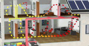 8、夏天模式:經過高性能空氣質量交換器(熱轉換器)置換凈化預冷的新鮮空氣進入室內: